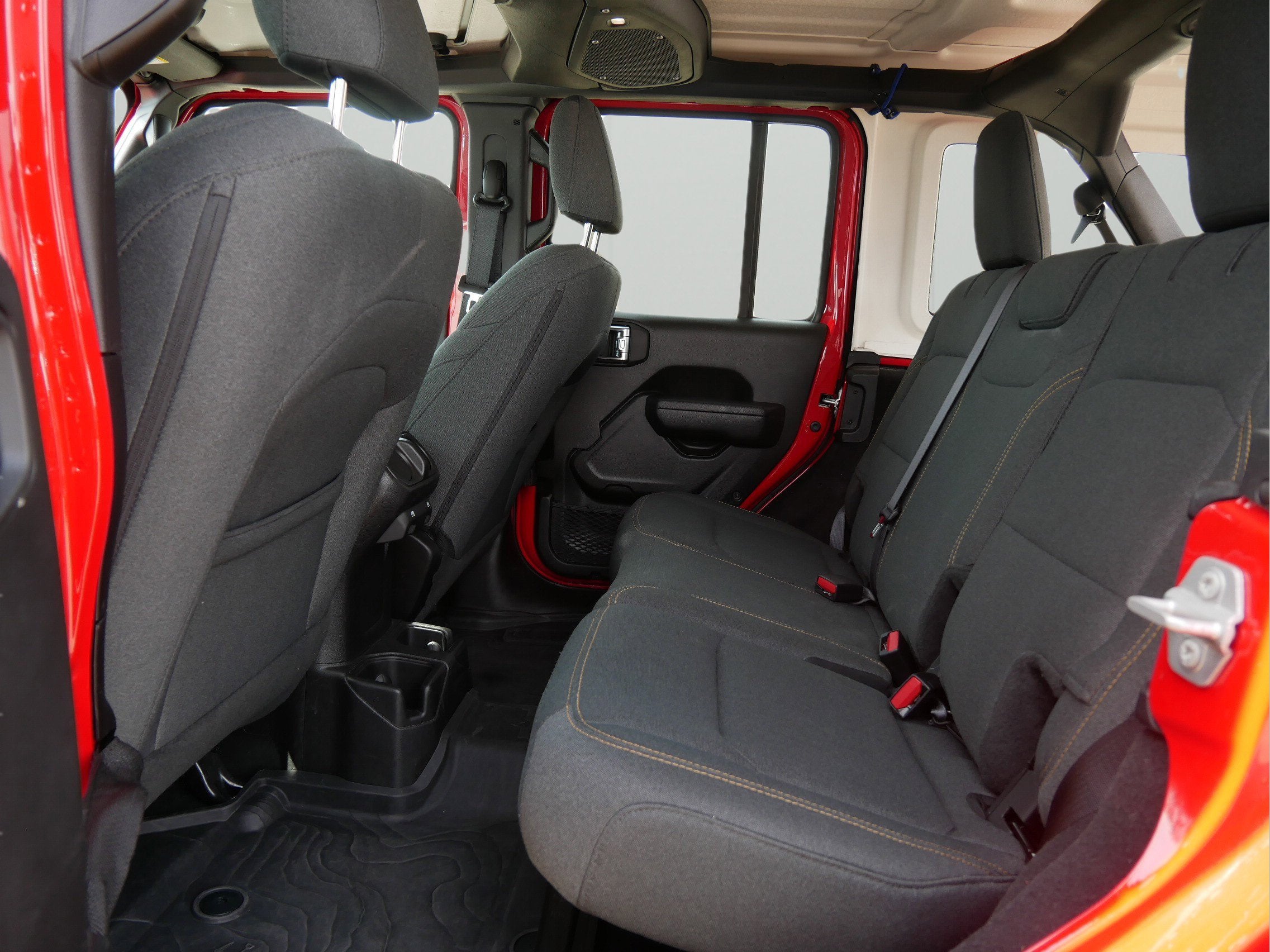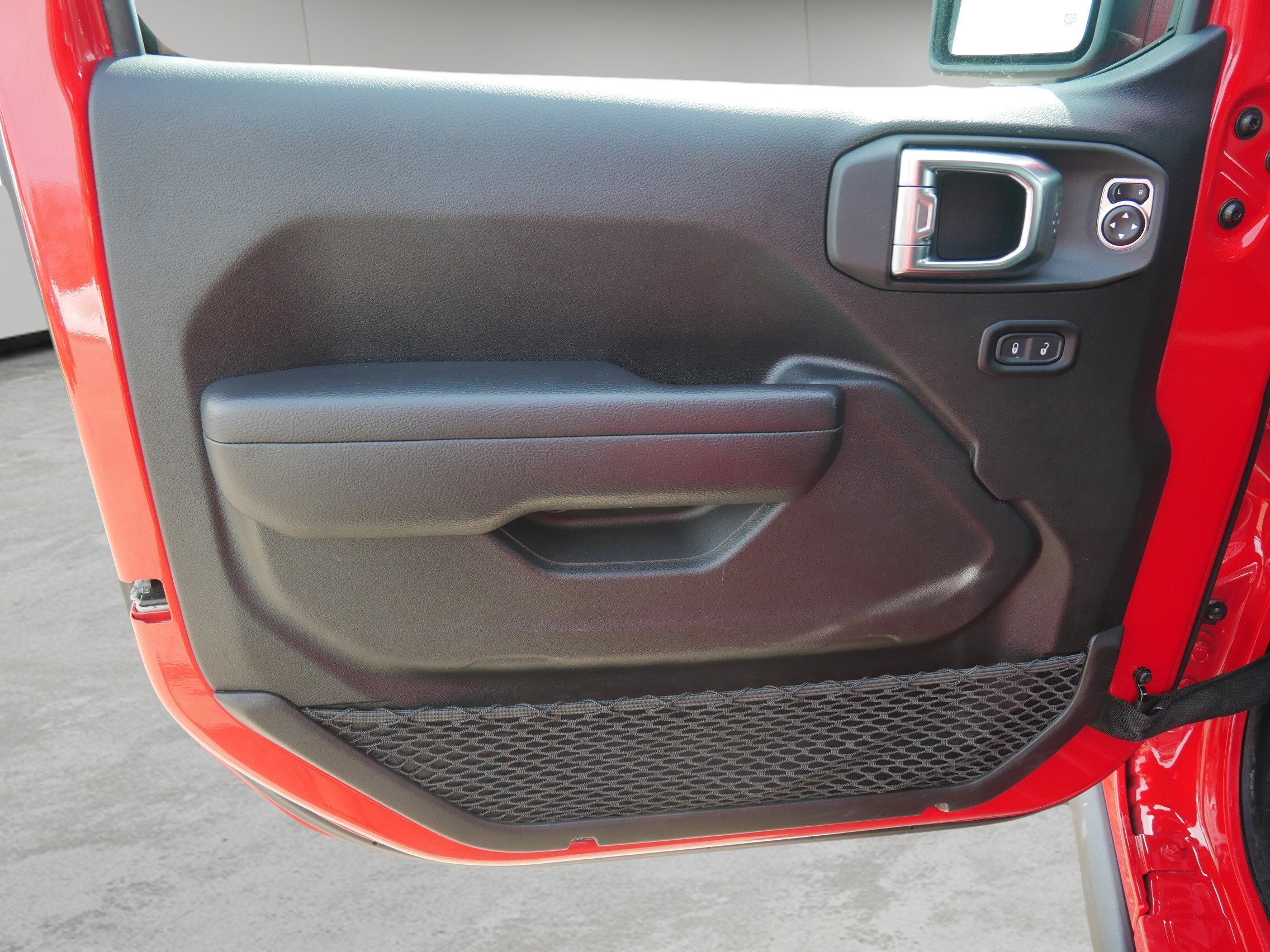 The exterior of the Wrangler Willys exudes a rugged, yet refined, aesthetic. The Firecracker Red Clearcoat paint, complemented by the Black Grille and Molded in Color Rubicon Highline Flare, creates a bold and distinctive appearance. The LED Premium Reflector Headlamps and Front LED Fog Lamps ensure exceptional visibility, while the Corning Gorilla Glass enhances durability.
